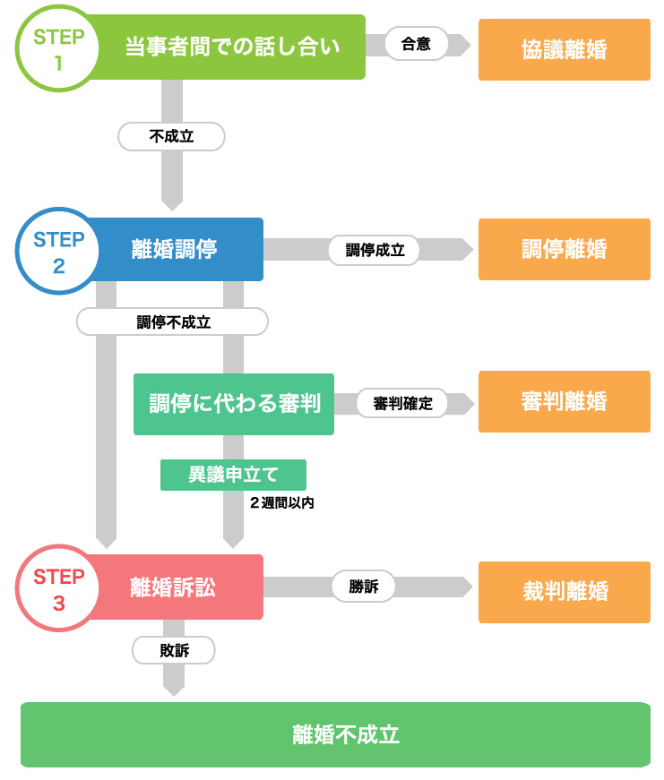 調停で当事者の意見に折り合いがつかず、不成立になった場合に、家庭裁判所が調停にかわって審判を下すことにより成立する離婚をいいます。審判に不服がある場合、2週間以内に家庭裁判所に申し立てると審判は効力を失い、訴訟に移行します。