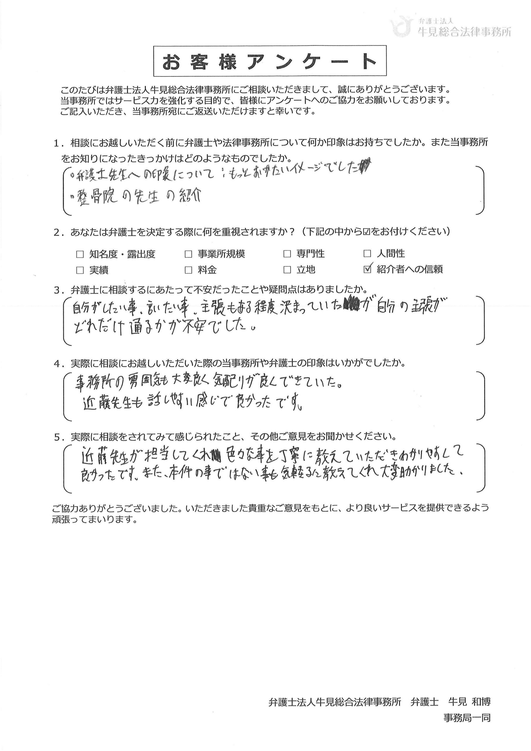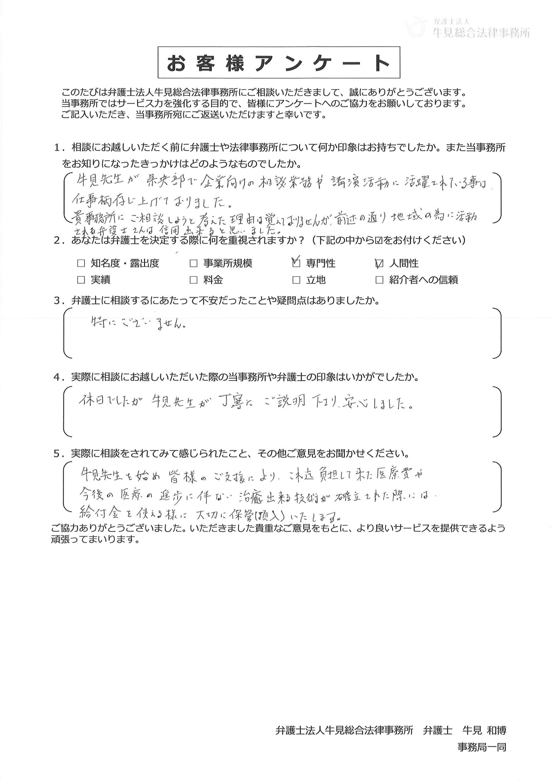 貴事務所にご相談しようと考えた理由は覚えておりませんが、前述の通り地域の為に活動される弁護士さんは信用出来ると思いました。